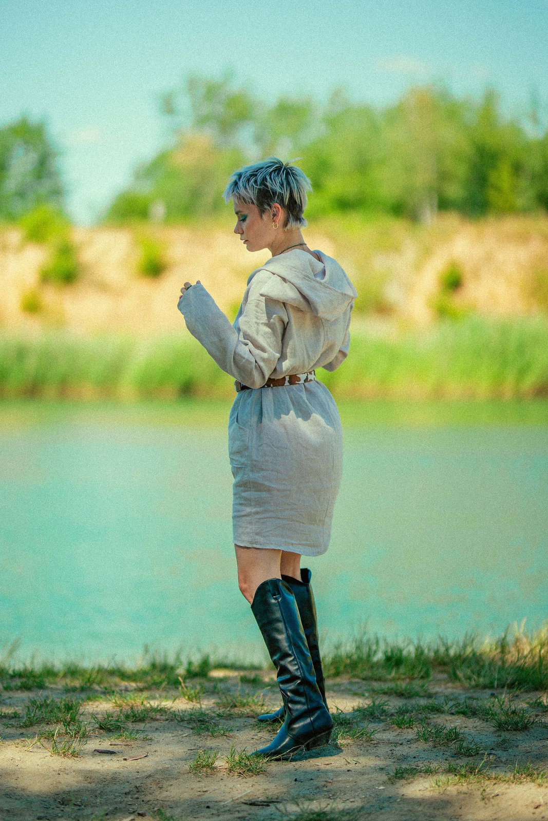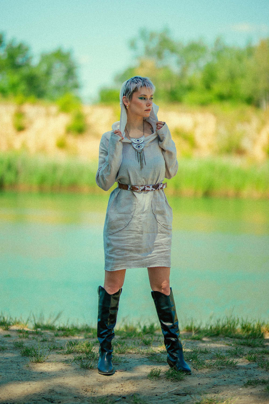 Sukienka lniana z długim rękawem i wielkim kapturem, polski len, polska produkcja, autorski wzór sukienki z lnu