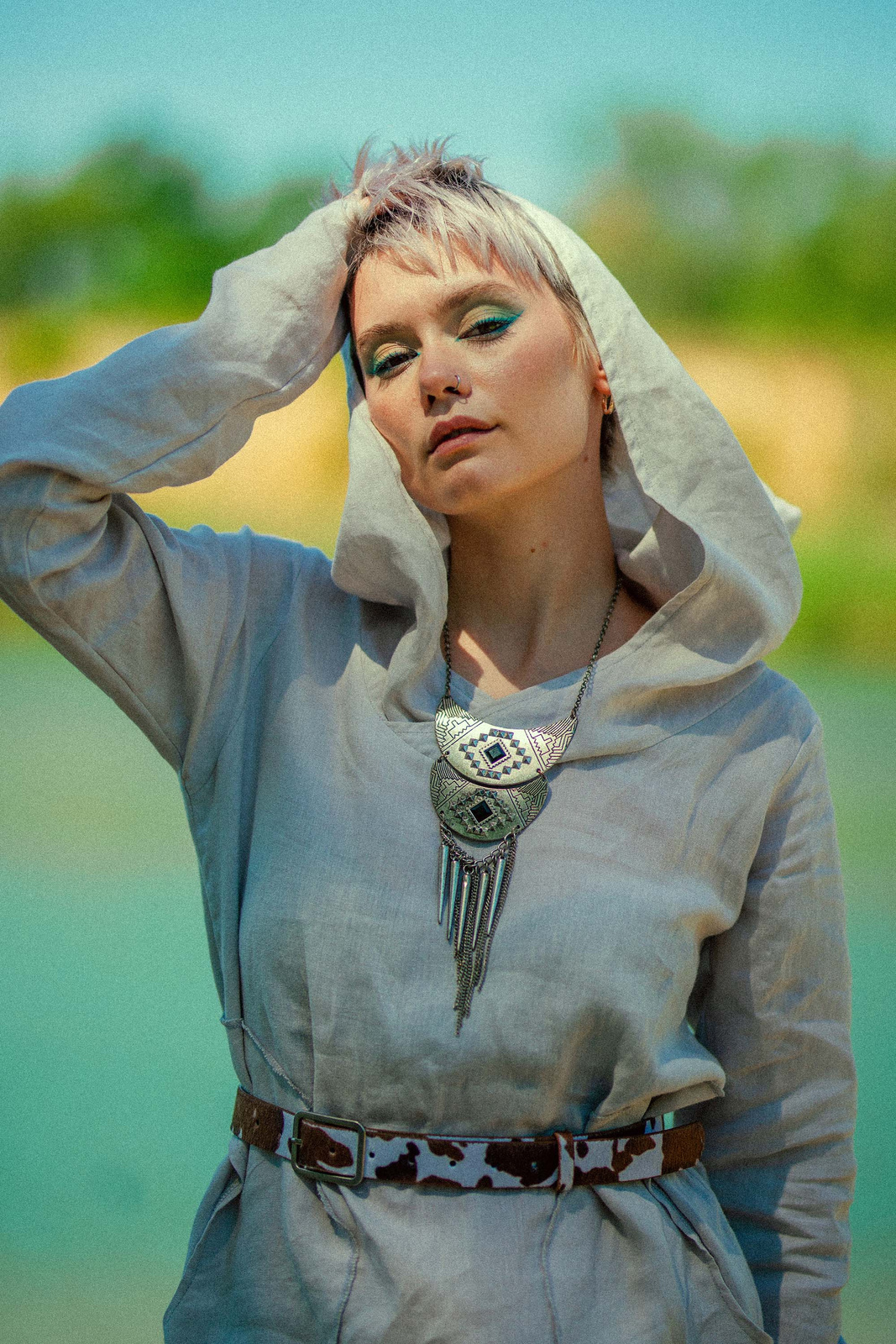 Luźna  lniana sukienka z dużym kapturem – naturalny len i szycie handmade