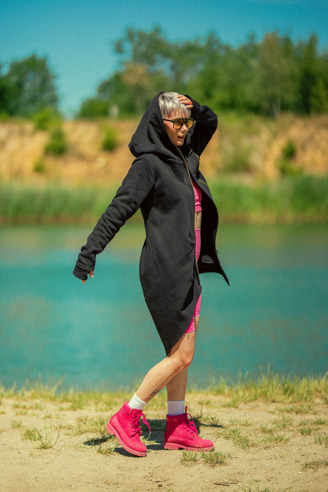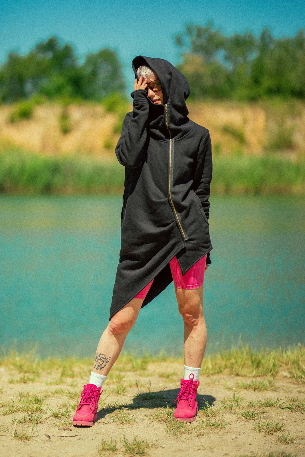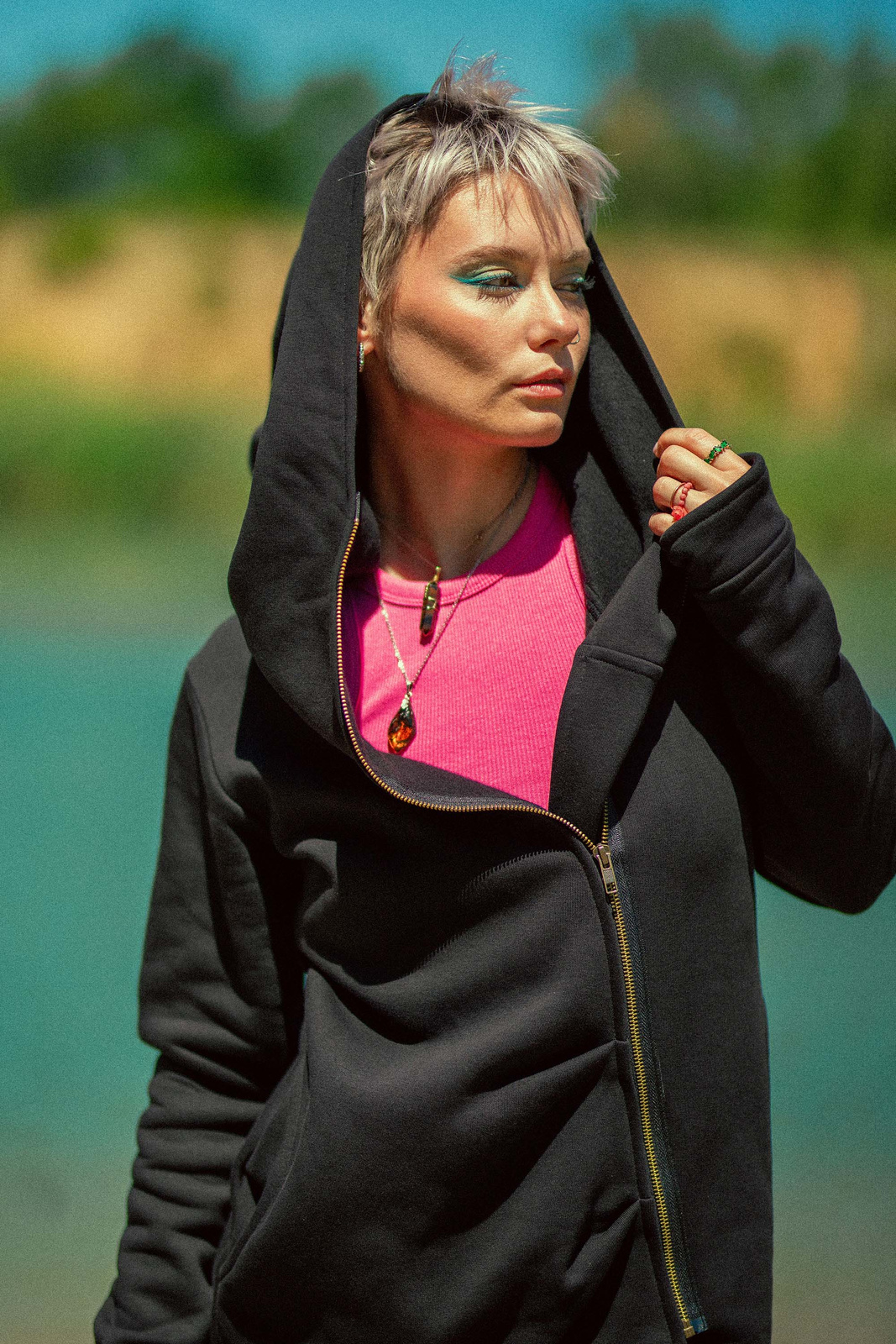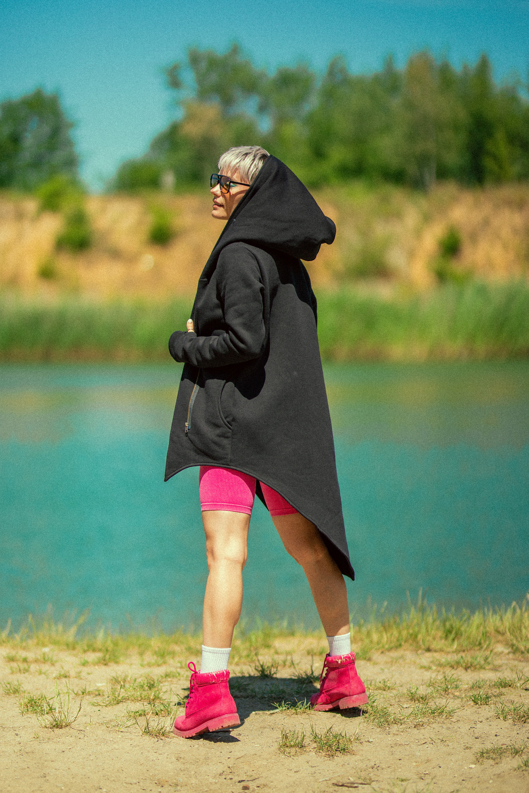 Asymetryczna bluza z kapturem, czarna bluza na zamek