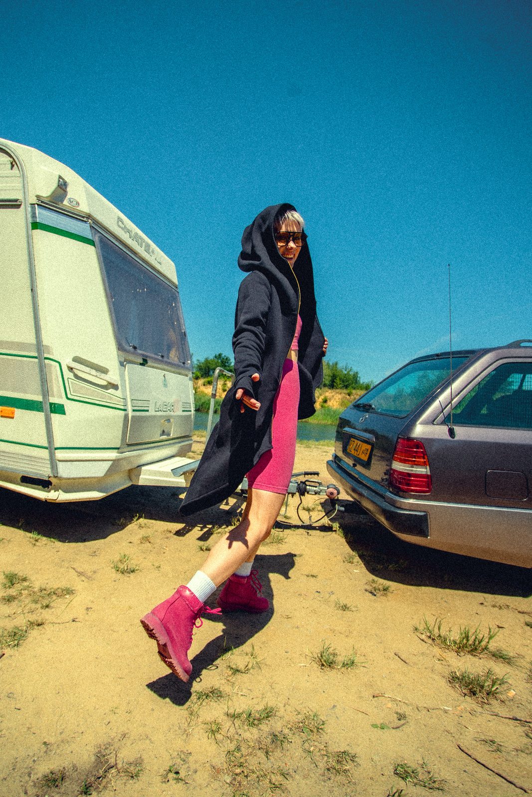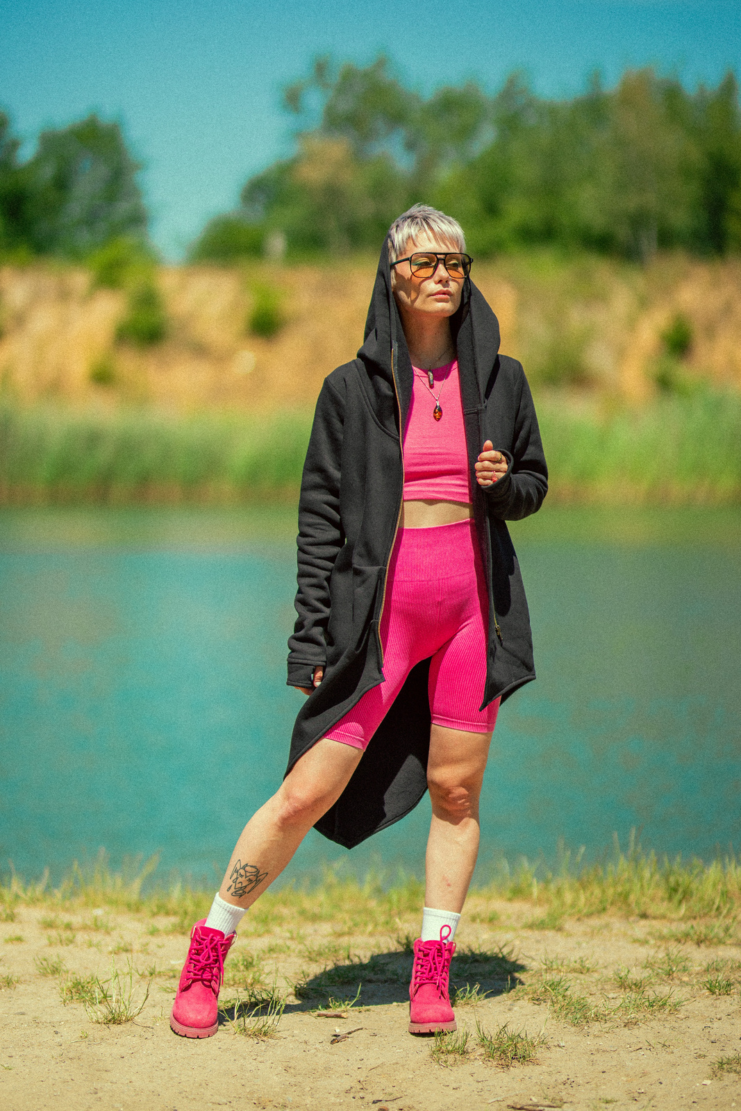 Niesztampowy płaszczyk damski Kami, dzięki nietuzinkowemu krojowi będzie wyróżniał Cię z tłumu. Wygląda jak bluza, a jego wyraźny asymetryczny fason jest wprost stworzony dla odważnych kobiet. Duży kaptur osłoni Cię przed chłodem. Przedłużone rękawy z otworem na kciuk zapewnią komfort cieplny dłoni, które możesz schować także w pojemnych kieszeniach bocznych.